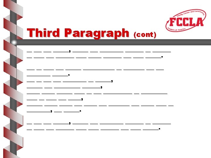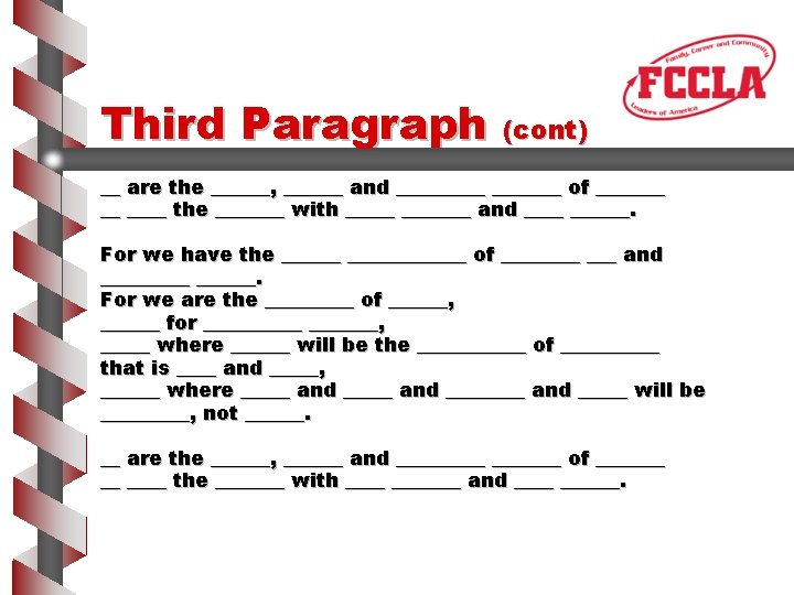 Second Paragraph (cont) __ are the ______, ______ and _______ of _______ __ ____ the _______ with _______ and ______. For we have the ____________ of ____ ___ and ______. For we are the _____ of ______, ______ for _______, _____ where ______ will be the ______ of _____ that is ____ and _____, ______ where _____ and _____ will be _____, not ______. We are the Family, Career and Community Leaders of America. We face the future with warm courage and high hope.