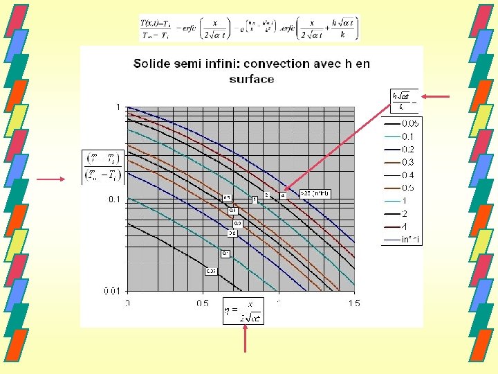 Cas d’une surface avec convection Si la surface est soumise à une convection avec un coefficient h et une température environnante T , l'expression de la température est: (voir la solution graphique) Remarque En pratique, on utilisera les solutions pour un milieu semi -infini quand le transfert de chaleur est limité à une faible épaisseur du matériau considéré (loin de la surface. . . c'est l'infini).