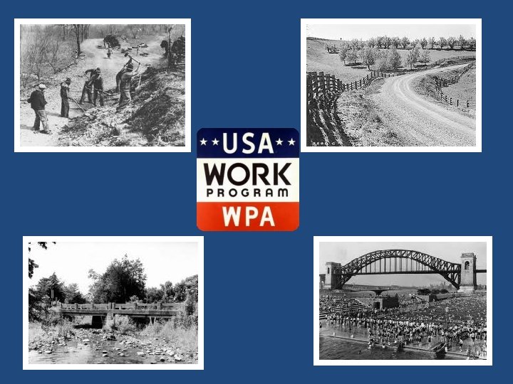 Works Progress Administration (WPA) • This enormous program put unemployed people to work building highways, bridges, public buildings, public parks, and airports. It also paid artists to paint murals and create the sculptures that decorate public buildings across the nation.