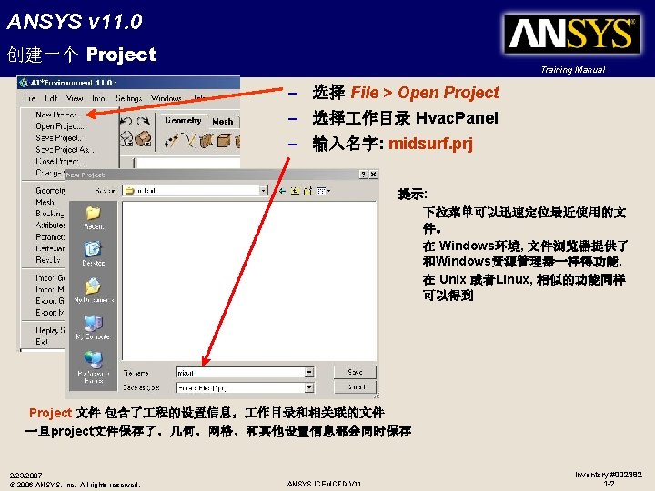 ANSYS v 11. 0 读入几何 Training Manual • 读入几何: – File -> Geometry -> Open Geometry – – #1 选择 panel_input. tin 开始表面是关掉的,在模型树里面打开显示表面 #2 #3 2/23/2007 © 2006 ANSYS, Inc. All rights reserved. ANSYS ICEMCFD V 11 Inventory #002382 1 -3