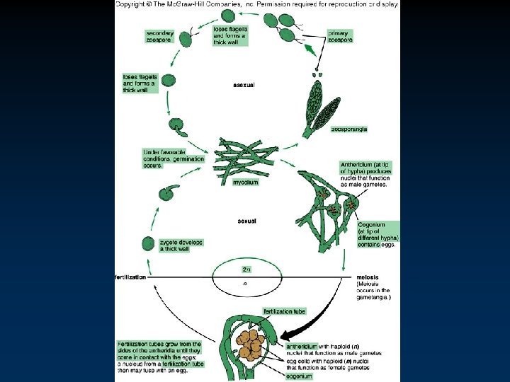 Phylum Oomycota • The Water Molds v Often found on dead insects. v Range in form from single spherical cells to branching, threadlike, coenocytic hyphae. - Coenocytic hyphae may form large thread masses (mycelia).