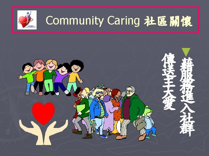 傳愛關懷中心 Agape Caring Center Goal ► 透過關懷作佈道 ► 透過佈道作關懷 ► 從近處傳到遠處 Spreading God’s abundant love from local to remote area by accomplishing God’s great commands and missions.