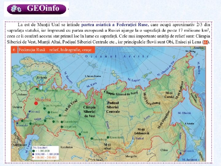 Analizează harta de mai jos și harta de la pag. 75 și precizează: 1. Numele unităților de relief marcate pe hartă cu literele A, B, C, D, E, F, G. 2. Denumirile orașelor marcate pe hartă cu cifrele 1, 2, 3, 4, 5, 6, 7, 8, 9. 3. Mările marcate pe hartă cu numerele 12, 14. 15. 4. Completează enunțurile de mai jos cu informația corectă: a. Orașul marcat pe hartă cu numărul 4 este situat în Munții. . . . . b. Cel mai adânc lac de pe glob, marcat pe hartă cu numărul 11, se numește. . . c. Orașul marcat pe hartă cu numărul 5 este situat pe fluviul. . . . . d. Fluviul marcat pe hartă cu numărul. . . Străbate Câmpia Siberiei de Vest/
