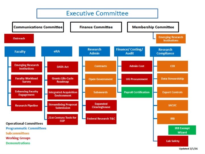 What kind of activities does the FDP do? • At its regular meetings, faculty and administrators talk face-to-face with decision-makers from agencies that sponsor and regulate research. • Test new ways of doing things in the real world before putting them into effect. • Information exchange – common practices shared. • Examples of successes: ◦ ◦ FDP Subaward Agreement template Standard Government-wide Terms and Conditions (what we now know as the Research Terms and Conditions began with the FDP!) FDP FCOI Clearinghouse Expanded Clearinghouse