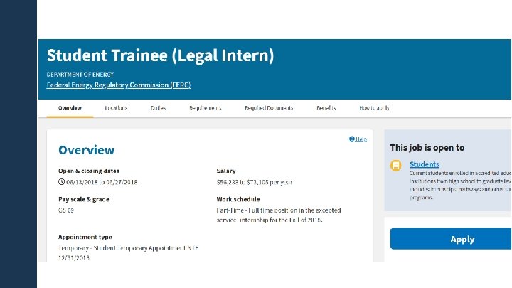 Understanding Vacancy Announcements DE • “Open to all sources”, anyone can apply. • Beginning April 2018, U. S. citizenship is now required for summer internships. MP • Applications will be accepted from current federal employees or employees that are reinstatement eligible. • Working for a federal contractor does NOT constitute “federal employment status. ” Students • Student Trainee=student internship • MUST submit their transcript or we cannot consider them