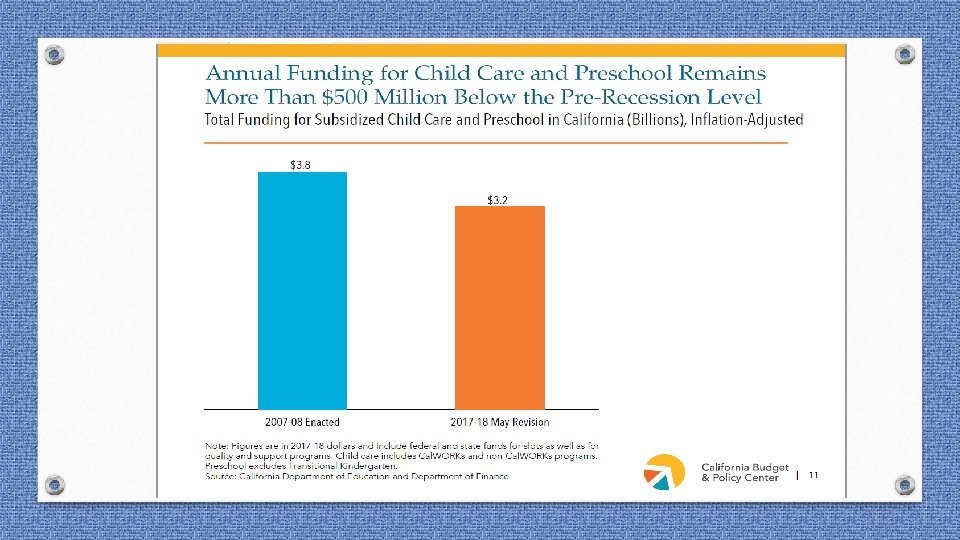 2018 Continuing Resolution (Spending Through September) Increased ECE Funding Slightly • CCDBG: $95 million • Head Start: $85 million ($80 million for COLA) • 21 st Century Learning Centers: $25 million increase