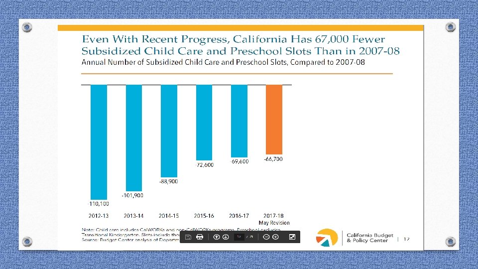Non-Fiscal Changes • Allows part day state preschool to enroll age-eligible children with exceptional needs without regard to income, once all otherwise eligible children have been enrolled • Aligns definition of homeless children and youth for state subsidized programs with federal Mc. Kinney-Vento definition (couch surfing) • Requires Legislative Analyst to develop health and safety regulations for LEA operated state preschools by 6/30/19 • Allows all contractors to use digital forms to enroll families