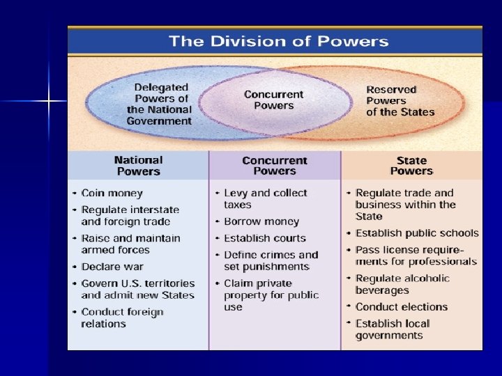 Exclusive/Concurrent Powers n Exclusive Powers – Can be exercised by the National Government alone are known as the exclusive powers. – Examples of the exclusive powers are the National Government’s power to coin money, to make treaties with foreign states, and to lay duties (taxes) on imports. n Concurrent Powers – Both the National Government and the States possess and exercise. – Power to levy and collect taxes, to define crimes and set punishments for them, and to claim private property for public use.