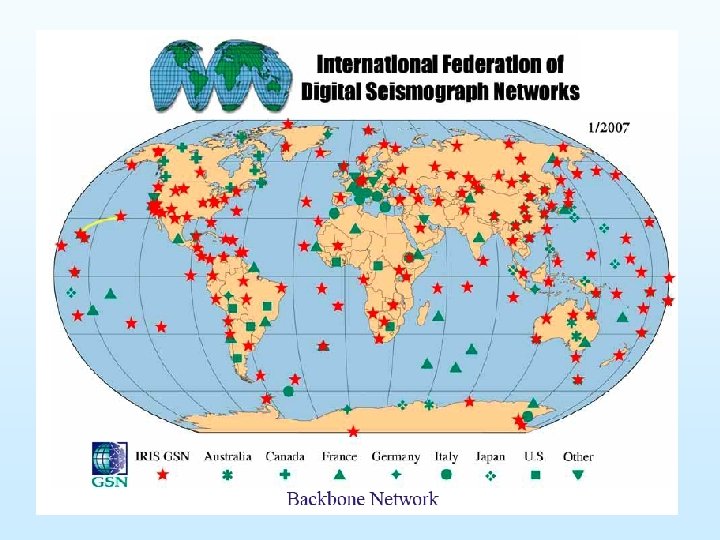 Federation of Digital Broad-Band Seismograph Networks The FDSN: Goals • Coordinates site selection, data exchange and instrument standardization • Promotes the installation of seismic stations. There about 2000 broad band sites now; 200 in real time (backbone stations) • Promote a variable network geometry approach: local, regional, national, worldwide scales • Promotes de the deployment of ocean bottom seimometers