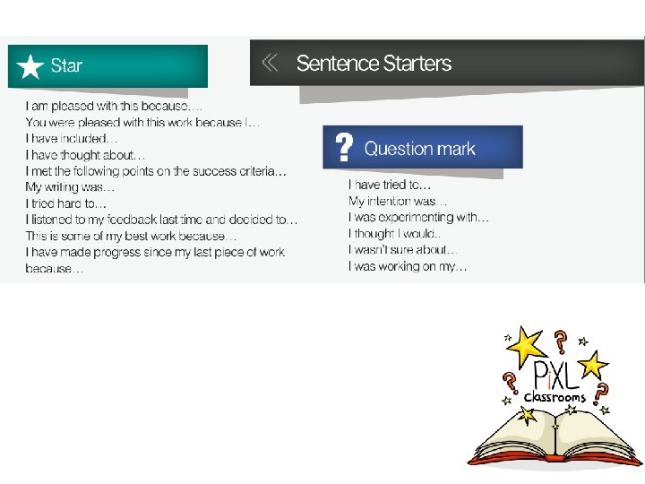 Feedback from teachers on ‘Feed Forward’ “It is much quicker for the teacher to point out errors and reduces the amount of writing required from staff” “Student have picked it up quickly and the sentence starters really help with self and peerassessment. Their comments are more meaningful” “The star tool is useful for showing students they’re doing well as sometimes I think marking is too much about errors”