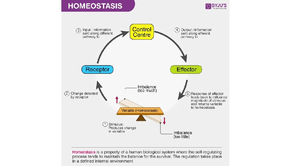 Principles of homeostasis • Organisms need to maintain a cellular environment that is optimal for cell function. • Homeostatic control systems have three functional components: Ø A receptor – to detect change Ø A control centre Ø An effector – to direct the Ø appropriate response