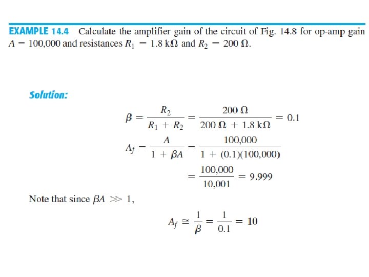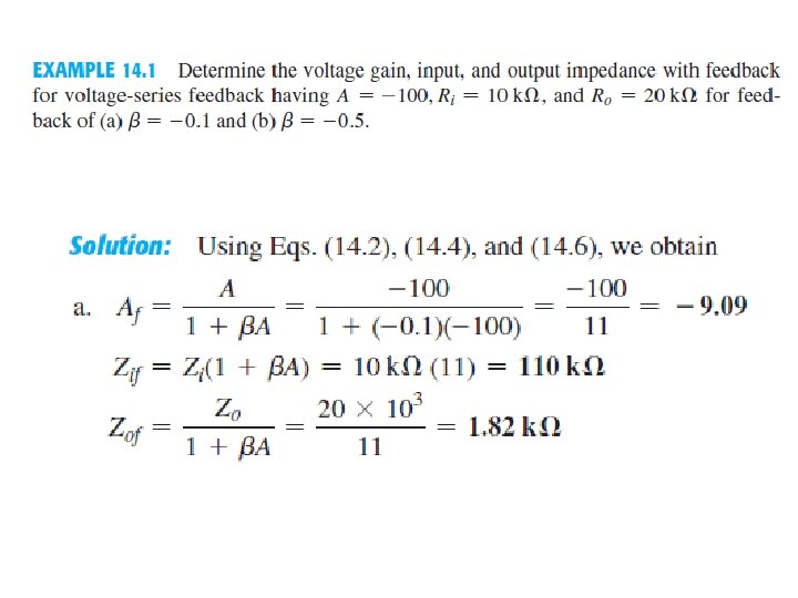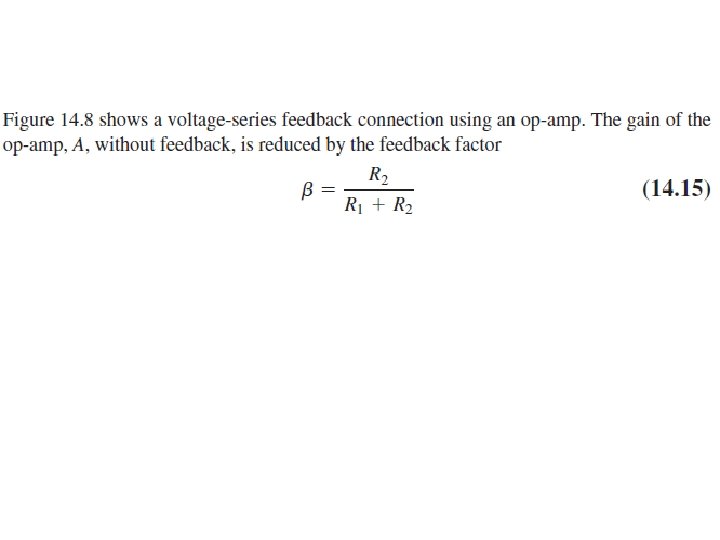 Figure 14. 2(a) shows the voltage-series feedback connection • with a part of the output voltage fed back in series with the input signal, • resulting in an overall gain reduction. • If there is no feedback (Vf = 0), the voltage gain of the amplifier stage is