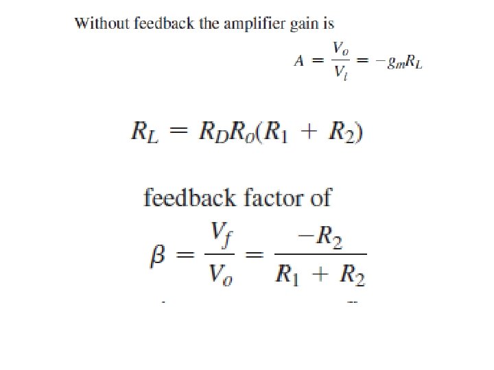 • So, the overall voltage gain with fb, • Eq. shows that the gain with feedback is the amplifier gain reduced by the factor (1 + βA). • This factor will be seen also to affect input and output impedance among other circuit features.