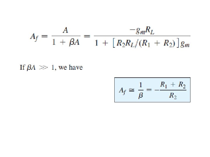 If A >> 1, • then Af ≈ 1 / β and • the effective amplification (or closed-loop gain) Afb is set by the feedback constant β, and • hence set by the feedback network, usually a simple reproducible network, – thus making linearizing and stabilizing the amplification characteristics straightforward.
