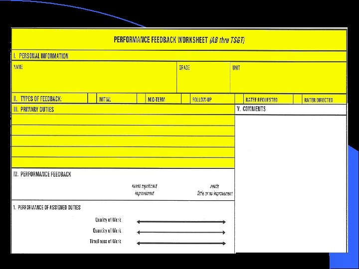 AF Form 931 and 932 PFWs – Section IV: Performance Feedback l Each subheading lists behaviors to be evaluated by placing an “X” on the scale in a position that most accurately reflects performance – Your philosophy of where you place the “X” must be explained to the ratee
