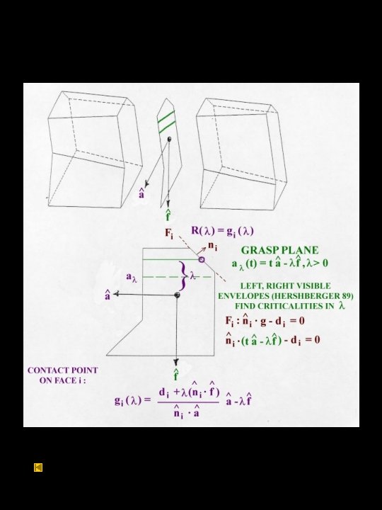 Result: 1. We can find candidate grasps in time O (n 3): • • Slicing part at critical heights, “Effective” , Nguyen regions, Algebraic formulation of stability: f (z) = 0 2. A pivoting grasp always exists if: • Part is convex with interior com, and • no slip.