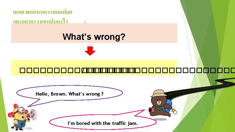 Conversation Bell : Good morning, John! How are you? John : Good morning, Bell. I’m not fine. Bell : What’s wrong? John : I’m bored with the traffic jam. How are you feeling today? Bell : I’m very happy because I have a music class today. It’s my favorite subject.