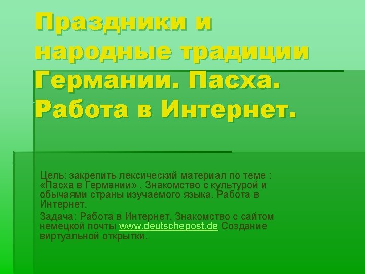 2. Thema, Ziel, Material, Hilfsmittel/Medien § Thema: “ Feiertage und Volkstraditionen in Deutschland. Das Osterfest. ” § Ziel : Wiederholung der Lexik zum Thema. Die Arbeit im Internet. Die Anfertigung einer Glückwunschkarte. § Material: Texte § Hilfsmittel/Medien: Tafel, Recorder, Projektor, Computer. Die 6. Klasse , die 1. Fremdsprache, das 5. Lernjahr