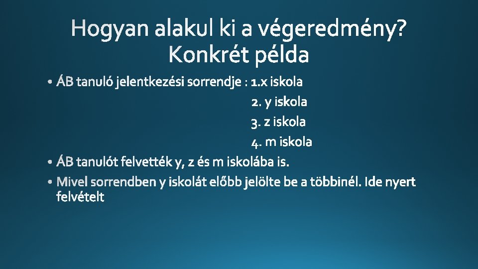 • Az Oktatási Hivatal az igazgatók által - tanulmányi területenként meghatározott felvehető tanulói létszámnak megfelelően, és a módosító kérelmeket is figyelembe véve, a felvételi rangsorok alapján megállapítja, hogy melyik iskola kinek a jelentkezését fogadta el. • Az intézményi listák beérkezését követően a Hivatal egy erre a célra kifejlesztett szoftver segítségével állapítja meg, hogy a tanuló hová nyert felvételt (egyeztetett felvételi jegyzék). • Ha ugyanannak a jelentkezőnek több felvételi kérelmét is elfogadták, a szoftver a tanulót az általa meghatározott sorrend szerint az első olyan tanulmányi területre helyezi el, amelyen az iskola jelezte, hogy felvenné, és egyben belefér a felvehető létszámba.