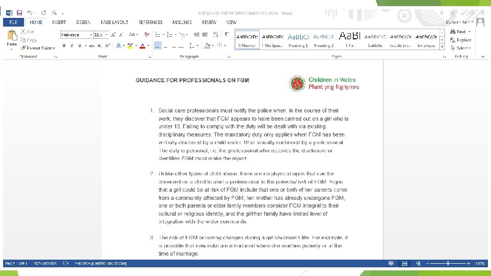 When to Report? Statutory guidance states “as soon as possible and in any event by the end of the next working day. FGM Act 2003 allows for reporting up to one month afterwards in “exceptional cases”, in this case a record of the reasons will need to be kept. May not always be possible to seek management advice before reporting. The duty is personal it cannot be delegated, or taken up by, another person.