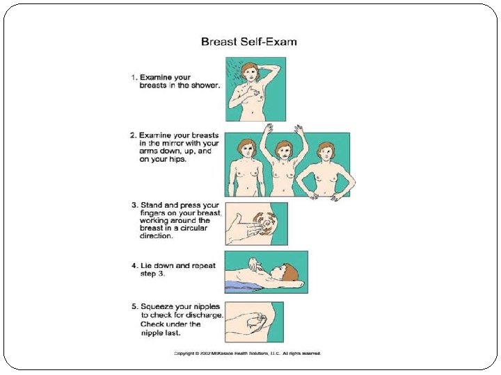 Risk factors: • Being female • Risk increases with age • A personal history of breast cancer. • A family history of breast cancer • In some cases, due to an abnormal gene • Radiation exposure • Beginning your period at a younger age. (before age 12) • • Beginning menopause at an older age. • • Having your first child at an older age. • Obesity, smoking, and delaying or avoiding pregnancy