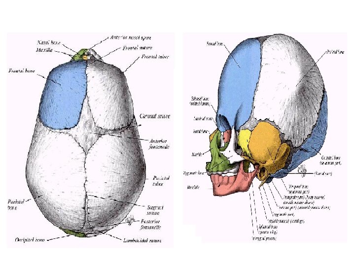 Fetal skull • Compared to an adult skull it has large cranium relative to the face • Most bones are incompletely ossified : > vault bones: ossify in membrane > base bones: ossify in cartilage During parturition bones can be displaced to the extent that they overlap each other at the sutures 1)'moulding‘. 2) Also the pelvic bones dilate through symphysis and sacroiliac bones