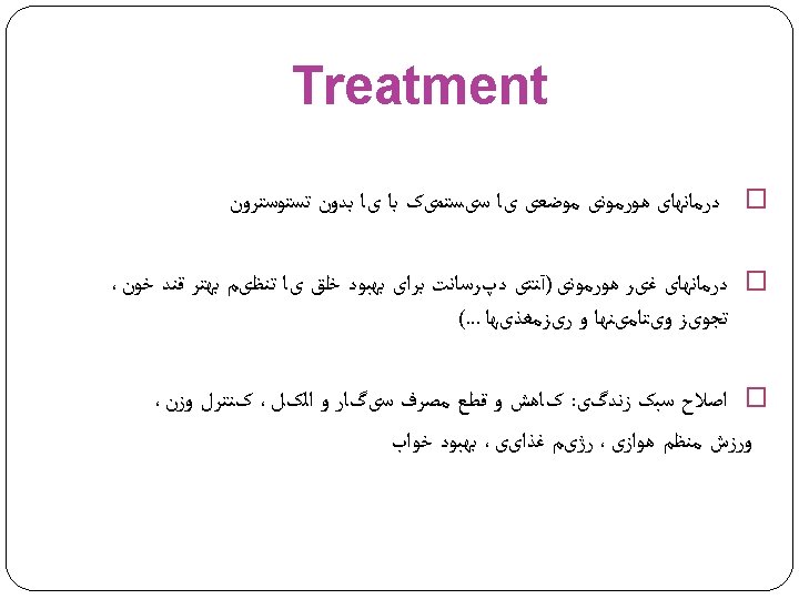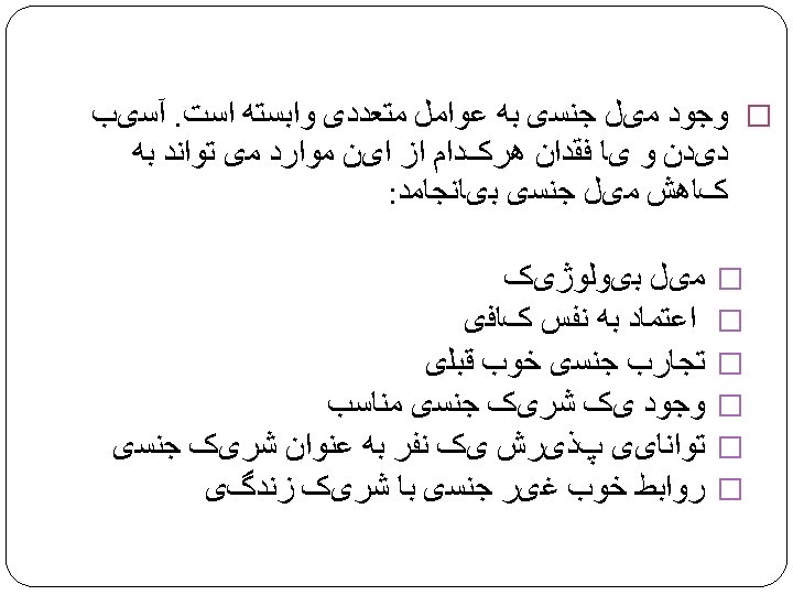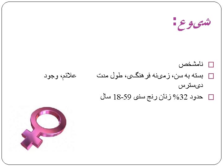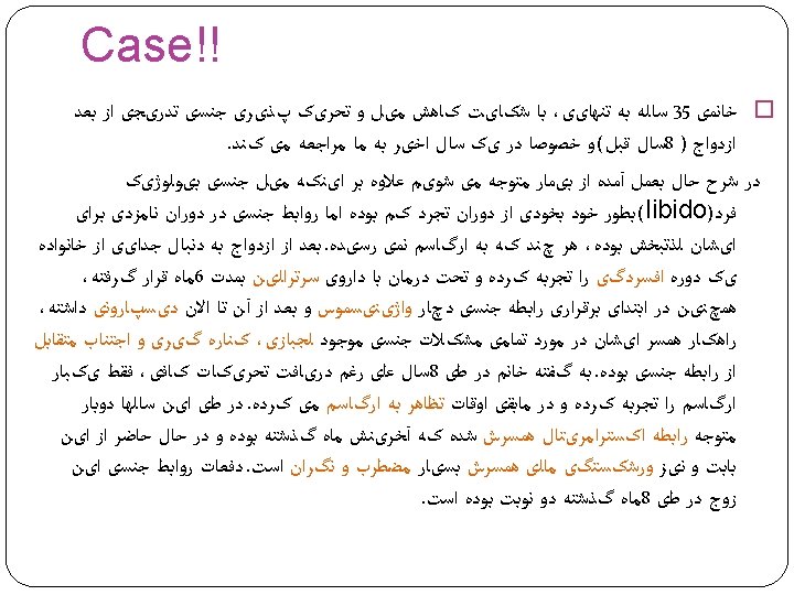 Psychosocial Factor � Sexual abuse & traumatic experiences � Sexual abstinence � Acute &chronic stress � Distraction � Self focus attention � Psychiatric Dis. Such as anxiety, Depression, OCD… � Partner sexual problem � Relation problem � Lack of sufficient stimulation/Lack of intimacy � Lack of privacy � Cultural aspects & Religious affiliation � Lifetime events as divorce, small children in home, Widower’s syndrome � Fear of pregnancy