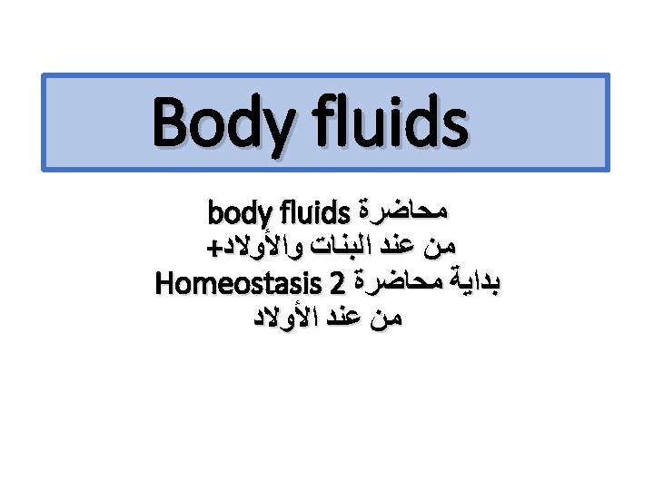 Body Fluid Compartment ﻫﺬﻱ ﻣﻦ ﺳﻼﻳﺪﺍﺕ ﺍﻷﻮﻻﺩ The water content of the body is divided into two compartments. 1) Intracellular compartment (ICF) Contained within the cell, represent approximately 67% of the total body water, 40% of total body weight. 2) Extracellular Compartment: (ECF) Contained within the vessels of the cardiovascular system, is the remaining 33% of the total body water, about 20 % of total body weight. the fluid portion of the blood, represents approximately 25% of the ECF. Blood volume, approximately 80 ml/kg of body weight (8%). Plasma sourrounds all cells except blood cells and includes Lymph (2 -3%) of total body weight. The ISF represent approximately 15% of the total body weight and 75% of the ECF. Interstitial fluid (ISF) is about 1 L, occupies approximately 15 ml/kg of body weight (1. 5%). * Represents fluid in the lumen of structures lined by epithelium and includes digestive secretions… etc. Transcellular fluid volume