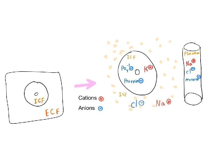 What happens to the different compartments with the administration of IV fluids? Adding hypertonic solution • ↑ ECF osmolarity • Water moves out of cells into ECF. • ICF volume decreases. • ECF volume increases. • ↑ ICF osmolarity Adding isotonic solution • No change in ECF osmolarity. cc occurs • No osmosis through cell membrane. • ECF volume increases. Adding hypotonic solution • ↓ ECF osmolarity • Water moves from ECF into ICF. cc • ICF volume increases. • ECF volume increase. • ↓ ICF osmolarity