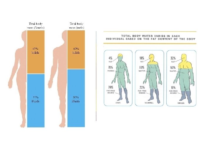 Total Body Fluid • • Total body water (TBW): consititutes 55 -60% of the body weight in young men and 45 -50% in young women. Why the percentage is lower in women? “The percentage of water is lower in women because they have higher fat content than men” The TBW Is distributed as follows: Muscle (50%) Skin (20%) Other organs (20%) Blood (10%) Infants have low body fat, low bone mass, and are 73% or more water.