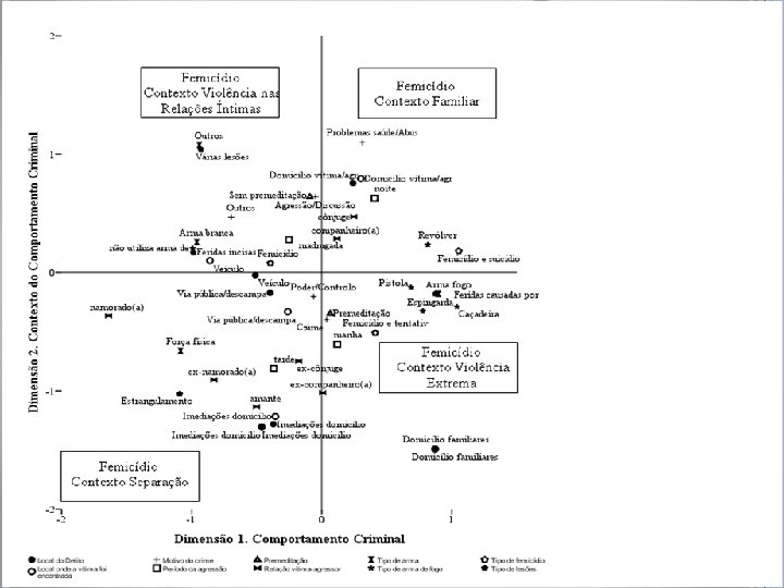 FEMICÍDIO NO CONTEXTO DA SEPARAÇÃO – 22. 4% Relação: Namorado; amante Força física – estrangulamento Motivação: Ciúme/medo de perda Vítima: 17 -27 anos de idade; desempregada, empregada limpeza, doméstica Agressor: 17 -27 anos de idade; desempregado, estudante, construção civil Antecedentes criminais: Por outros delitos (e. g. furto, tráfico) Filhos de relações anteriores ou sem filhos Em processo de separação Nº Vítimas: 2 vítimas (atual companheiro, colegas de trabalho, pais) Jovens, empregos instáveis e precários, relações menos duradouras Problemas de saúde mental: Psicopatia e depressão