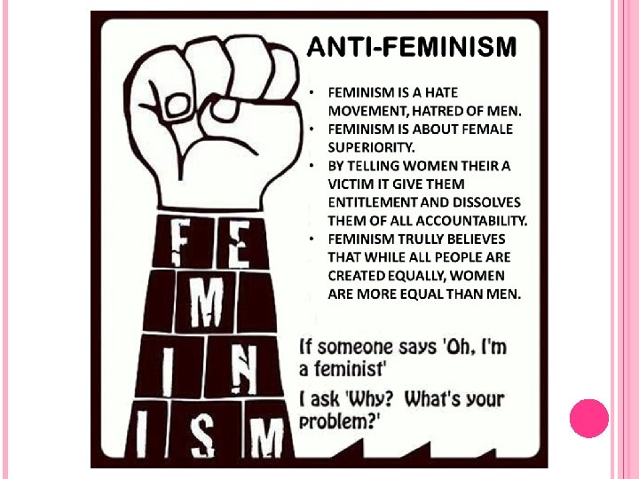 KAREN OFFEN’S DEFINITION OF FEMINISM “As an ideology, feminism incorporates a broad spectrum of ideas and possesses an international scope, one whose developmental stages have historically been dependent on and in tension with male-centered political and intellectual discourse but whose more recent manifestations transcend the latter. Thus, feminism must be viewed as not intrinsically a subset of any other Western religious or secular ideology, whether Catholic or protestant Christian, Judaic, liberal, socialist, or Marxist. ” Although feminism is pro-woman, it is not anti-man