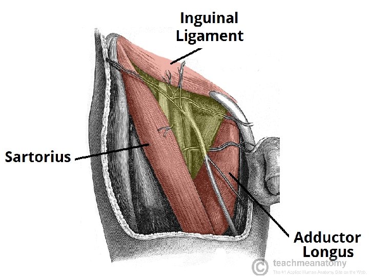 Laterally: Medial border of the Sartorius. Medially: Medial border of the adductor longus. Base: Inguinal Ligament. Apex: Point of joining of both the borders.