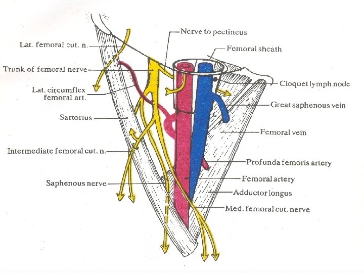 Contents Femoral Artery and its branches. Femoral Vein and its tributaries. Femoral sheath. 4 Nerves. Deep inguinal lymph nodes.