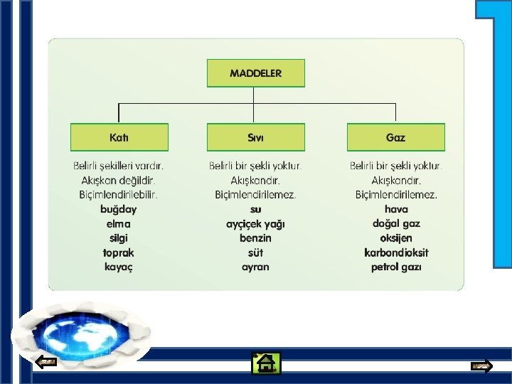 MADDENİN HALLERİ Katı Maddeler Taş, tahta, hamur gibi maddeler katı maddelerdir. Katılar akışkan değildir. Katı maddeler düzgün olmasa da belli şekilleri vardır. Katıların şekilleri dışarıdan bir etki olmadıkça değişmez. Sıvı Maddeler Su, zeytinyağı, limonata gibi maddeler sıvı maddelerdir. Sıvı maddeler akışkandır, belirli şekilleri yoktur. Sıvılar konuldukları kabın şeklini alır. Bu nedenle şekilleri değişkendir. Yukarıdaki resimde portakal suyu sürahinin ve boşaltıldığı kadehle ve bardağın şeklini almıştır.