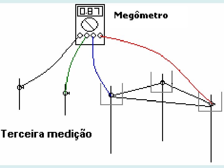 Aterramento • Para medir um aterramento, devemos faze -lo diretamente junto as hastes, utilizando um Megometro ou terrometro. • Existem megometros/terrometros que tem 3 ou 4 pontos de conexão simultânea. • A medição é feita no mínimo por três vezes em direções diferentes, seguindo a linha das hastes conforme simulação