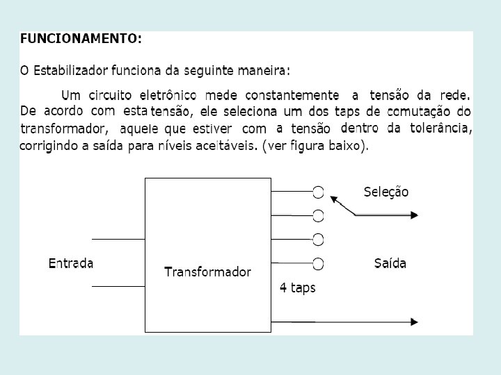 O que é? • O estabilizador é um equipamento que corrige a tesão que recebe da rede elétrica e a fornece estabilizada aos equipamentos, protegendo-os desta forma contra tensões inadequadas (sub/sobretensão). • Os estabilizadores incorporam o filtro de linha e o varistor, tornando-os eficientes também contra ruídos e surtos de tesão.