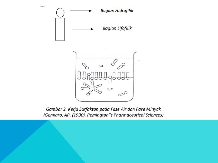 ADSORBSI PADA ANTARMUKA CAIRAN v Molekul-molekul dan ion-ion tertentu apabila terdispersi dalam cairan akan bergerak dengan sendirinya ke arah antarmuka masing-masing fase. Hal ini disebut sebagai adsorpsi. v Selain kata adsorbsi, dikenal juga istikan absorpsi. v Adsorpsi adalah hanya terdispersi di permukaan fase saja, contohnya cat yang ada di permukaan tembok, sedangkan absorpsi adalah zat menembus ke dalam ruang-ruang kapiler dari zat pengabsorpsi, misalnya peresapan air oleh busa (sponge). v Molekul dan ion yang diadsorpsi pada antarmuka dinamakan zat aktif permukaan (surfaktan) atau amfifil. Sebagai contoh alkohol-alkohol rantai lurus, amina-amina dan asam. v Surfaktan adalah satu bahan penolong untuk membuat emulsi, berfungsi untuk menstabilkan zat atau bahan aktif terlarut dalam air atau minyak yang diemulsikan. Bahan aktif permukaan terdiri dari bagian lifofilik (rantai alkil) dan bagian hidrofilik (grup karboksil dan