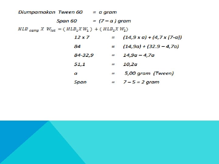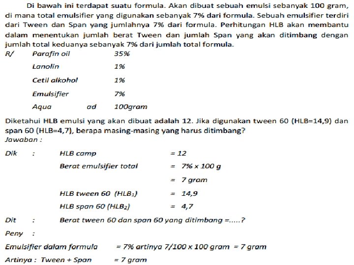 PERHITUNGAN HLB CAMPURAN v Perhitungan HLB campuran digunakan dalam menghitung berapa bagian hidrofilik dan lipofilik yang tertimbang dalam suatu formula.