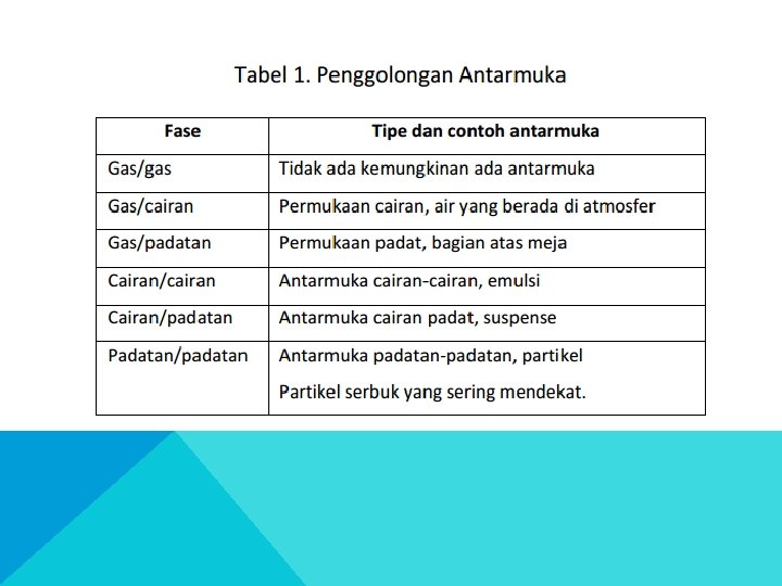 PERHITUNGAN TEGANGAN ANTARMUKA v Tegangan permukaan adalah gaya per satuan panjang yang diberikan sejajar dengan permukaan untuk mengimbangi tarikan ke dalam. Tegangan permukaaan mempunyai satuan dyne dalam cgs. v Tegangan antarmuka adalah gaya per satuan panjang yang terdapat pada antarmuka dua fase cair yang tidak bercampur, mempunyai satuan dyne/cm. Tegangan antarmuka selalu lebih kecil dari pada tegangan permukaan karena gaya adhesive dua fase cair yang membentuk suatu antarmuka adalah lebih besar daripada bila suatu fase cair dan suatu fase gas berada bersama-sama. Jadi, bila cairan bercampur dengan sempurna, tidak ada tegangan antarmuka yang terjadi.