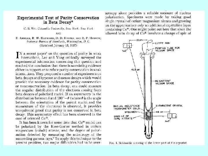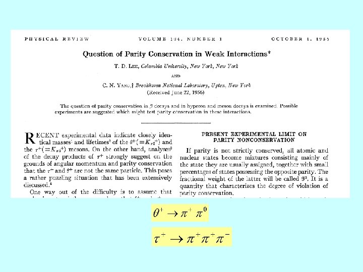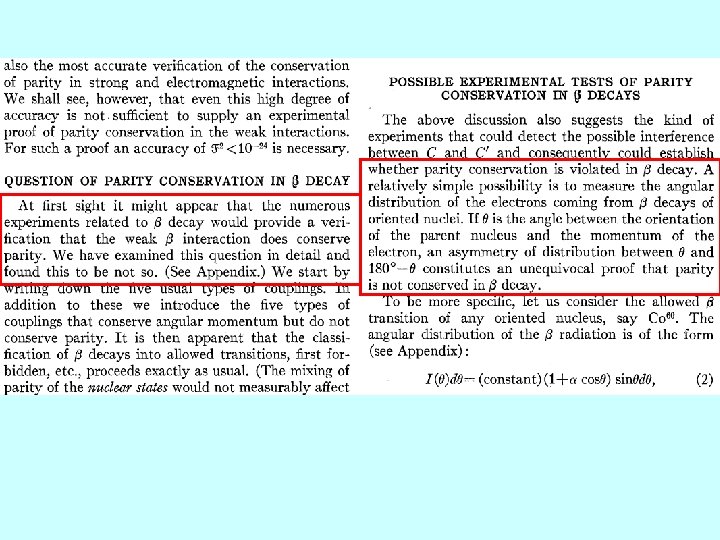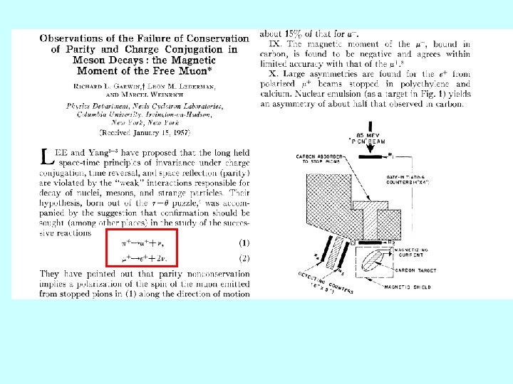 The results are shocking to everybody! I do not believe that the lord is a weak left-hander. I am ready to bet a very large sum. Pauli Ten days later…… “ Now after the first shock is over, I began to collect myself again” “I was to give a lecture at 8: 15 PM on the “past and recent history of the neutrino”. At 5: 00 PM the mail brought me three experimental papers. Now where shall I start? It is good that I did not make a bet. ”
