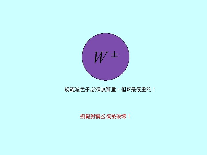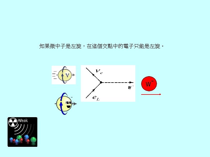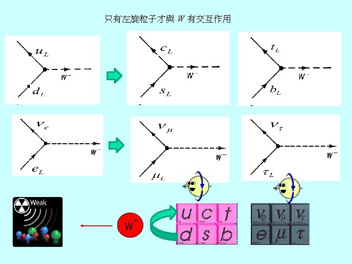 弱交互作用不是 Isospin SU(2) gauge interaction 而是 Left-Handed Isospin SU(2)L gauge interaction Left-Handed Isospin SU(2)L L W 是 Left-Handed Isospin SU(2)L的規範粒子 ! L