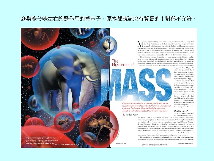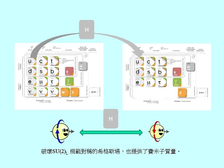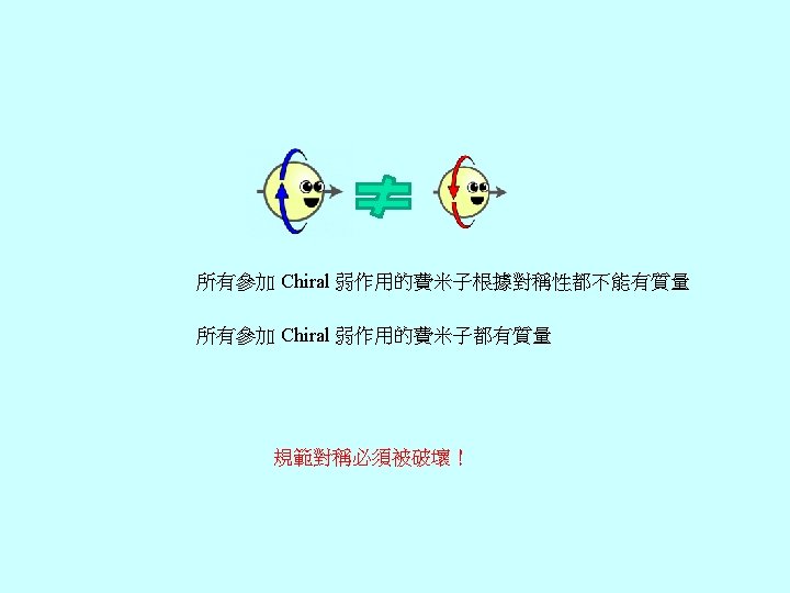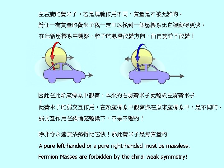 左右旋的費米子,弱交互規範作用是不同的。 Weak interaction is Chiral. (弱作用是能分辨左右的) Left-handed fermions act differently from Right handed Fermions. 但…………….