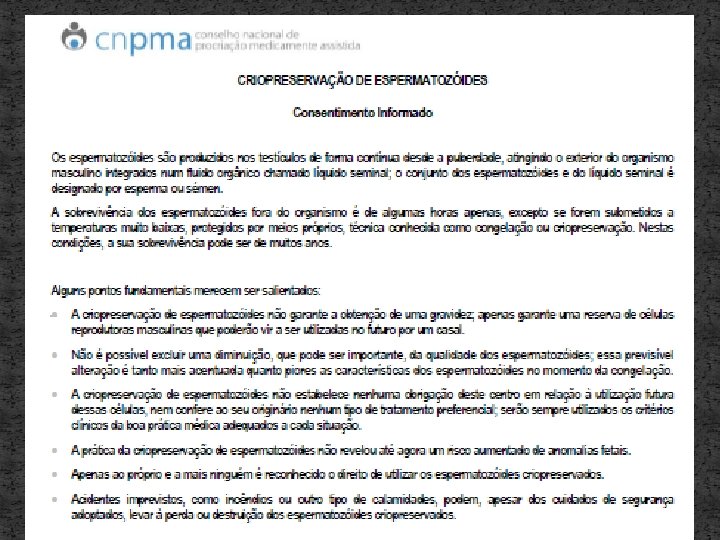 Fertilidade e Oncologia �Apesar de todas as técnicas há um grupo que vai permanecer, sempre, azoospérmico. �Não é possível predizer quem vai recuperar a espermatogénese �A única medida eficaz para assegurar a fertilidade é a criopreservação do esperma antes da quimioterapia. �A Criopreservação é o “gold standard”.