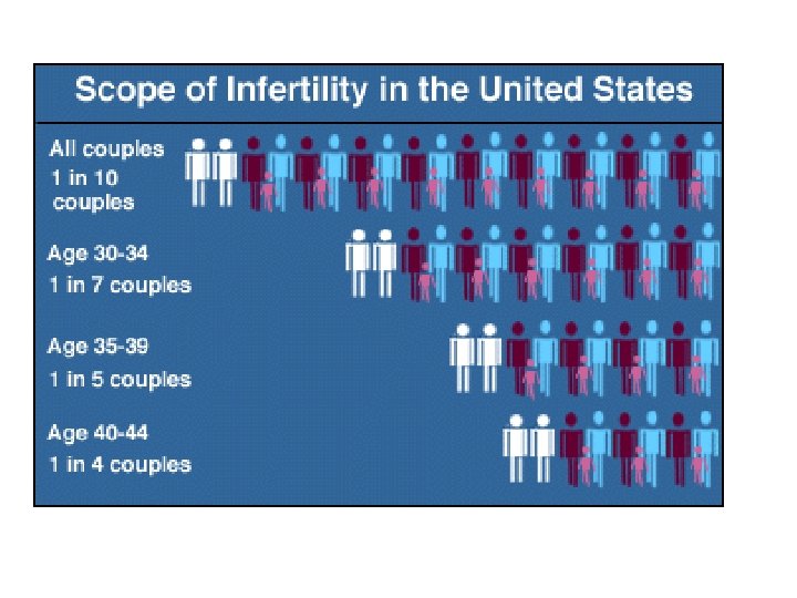 Fertility Facts Definition: unprotected sex for one year, not pregnant Frequency: 1 out of 6 couples in the US Responsibility: 35% female infertility 35% male 20% both 10% unknown Maternal Age USA 20 -24 25 -29 4. 1% 5. 5% 30 -34 35 -39 85% treated successfully 9. 4% 19. 7% Increase 1970 -now-Why?