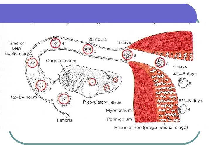Fertilization l Occurs in the ampullary region l Ovulation takes place at the middle of the menstrual cycle l About 200 – 300 spermatozoa reach the site of fertilization