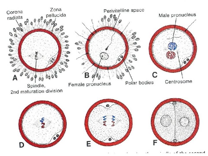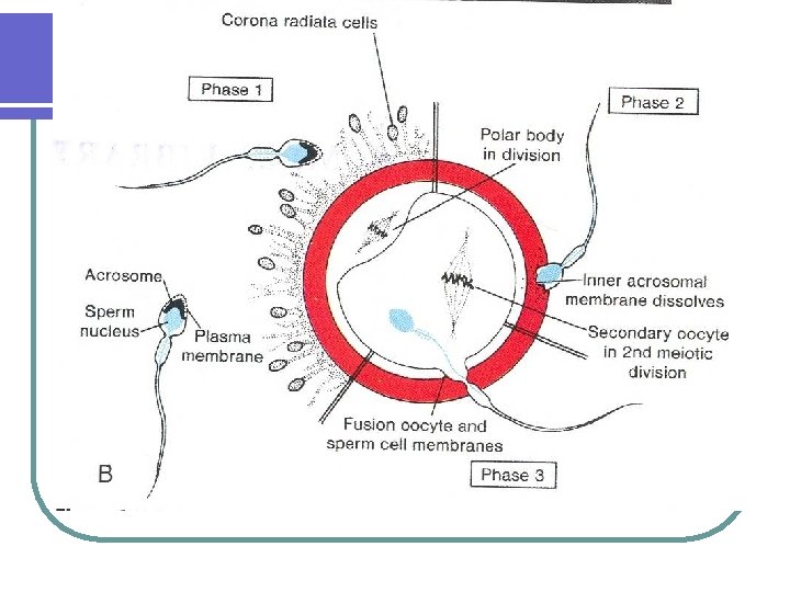 Phases of fertilization l Passage of sperm through corona radiata l Penetration of the zona pellucida by the sperm l Fusion of oocyte and sperm cell membrane l Completion of the second meiotic division of the secondary oocyte