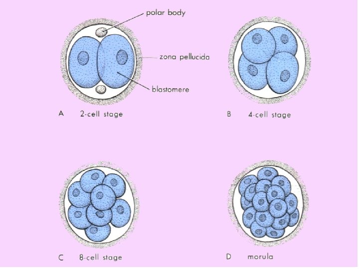 CLEAVAGE Important points Definition: one cell divides into 3 cell stage then into 4 cell, 5 cell stage etc. this process of subdivision of fertilized ovum is called cleavage 2 daughter cells are still surrounded by the zona pellucida Each daughter cell is much smaller than the ovum As subcequent divisions, the cell becomes smalller and smaller until they acquire the size of most cells of the body