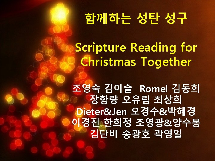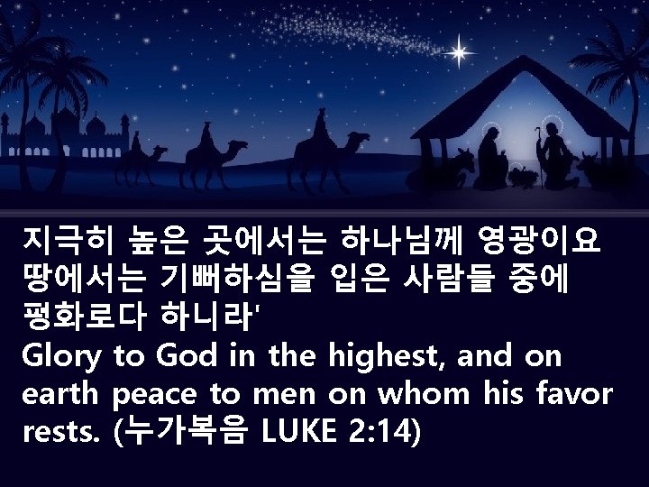 Today, let us confess together the love to the Lord; "Merry Christmas! we love you to come here" Also let us receive Jesus Christ who save us from our sins and deaths. Jesus came to here as the light. The light eliminates the darkness. If anyone receive Jesus Christ who was born in the poor stable, they can gain the light of life saving from sins and deaths. This is the unchangeble truth which God Almighty promised us.
