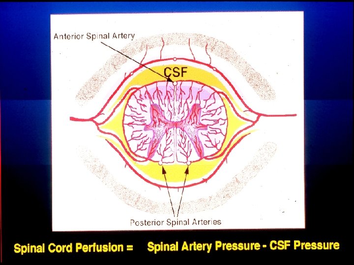 Thoracoabdominal Aortic Aneurysms Thoracic aortic occlusion significantly increases spinal fluid pressure and decreases spinal cord perfusion Drainage of CSF increases spinal cord perfusion pressure and decreases the incidence of paraplegia “CSF drainage may be a useful adjunct to prevent paraplegia following Th. AAA repair. ” *Mc. Cullough, Hollier, Nugent. J Vasc Surg 1988; 7: 153 -60